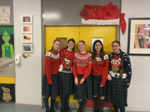 On Friday we held our annual St Vincent de Paul collection. Both staff and students got into the Christmas spirit by wearing their Christmas jumpers to school. Members of the student council collected at the school gates while others sold chocolate and raffle tickets and candy canes to raise as much as possible for the charity. The junior choir added to the festive atmosphere, singing carols while the school trad group made a special appearance at the train station cheering up commuters at the end of a busy week with their beautiful melodies. The Student Council also organised the annual Christmas classroom door decorating competition, creating fierce competition between staff to have the best decorated door. The spirit of Christmas was alive and well and all in aid of the St Vincent De Paul Society. Many thanks to the many local businesses who donated fabulous prizes for the raffle and to those who gave so generously to our collection today. All proceeds will go to the local branch of Vincent de Paul which does such fantastic work in the area.